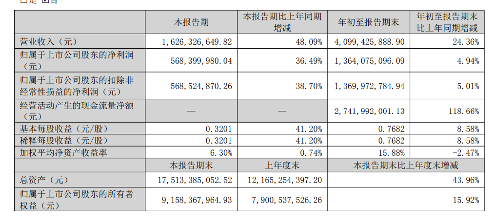 业绩情况:2025 年 1-9 月,公司实现营业收入 409,942.59 万元,较上年同期增加24.36%;归属于上市公司股东净利润 136,407.51 万元,较上年同期增加4.94%。截至2025 年 9 月 30 日,公司资产总额 1,751,338.51 万元,归属于上市公司股东的净资产915,836.80 万元。