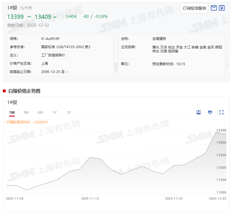 现货市场方面,12月2日,银价高位震荡小幅上涨,TD-沪银主力2602合约基差收窄叠加光伏终端消费转淡,部分持货商调低现货升水报价。上海地区国标银锭持货商主流报价对TD升水下调至20-25元/千克或对沪期银2602合约贴水5-10元/千克,另有部分大厂银锭对沪期银2602合约升水10元/千克或对TD升水35-40元/千克挺价惜售。下游终端积极议价、逢低升水少量备库,持货商报价差异仍存,现货市场成交氛围清淡不改。