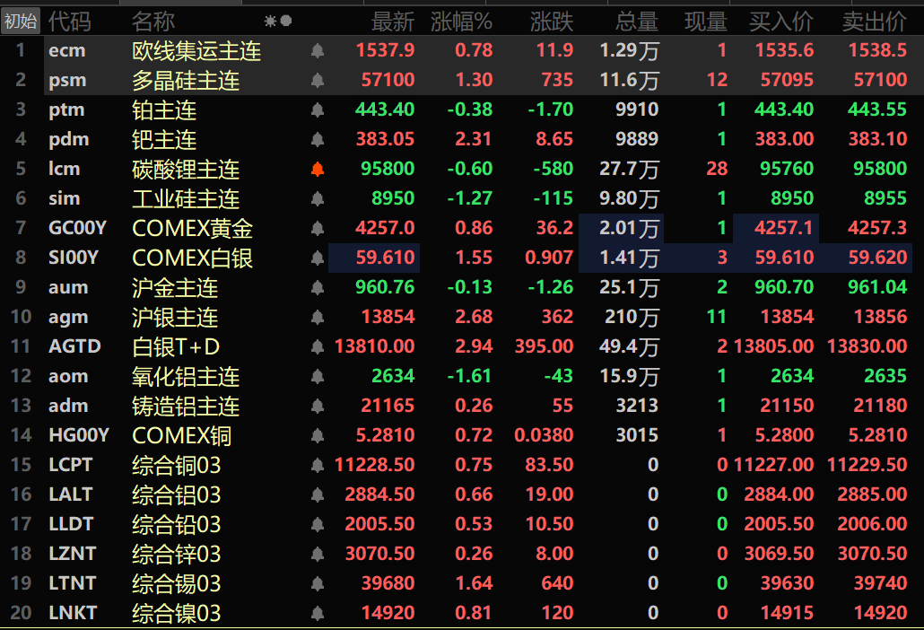 此外,铸造铝主连期货涨0.26%,氧化铝主连跌1.61%。碳酸锂主连跌0.6%。工业硅主连跌1.27%。多晶硅主连涨1.3%。
