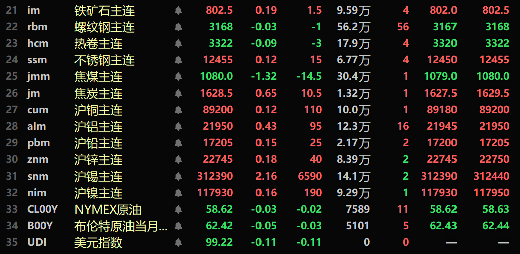黑色系涨跌互现,铁矿涨0.19%,螺纹、热卷微跌,不锈钢涨0.12%。双焦方面:焦煤主力合约跌1.32%,焦炭主力合约涨0.65%。