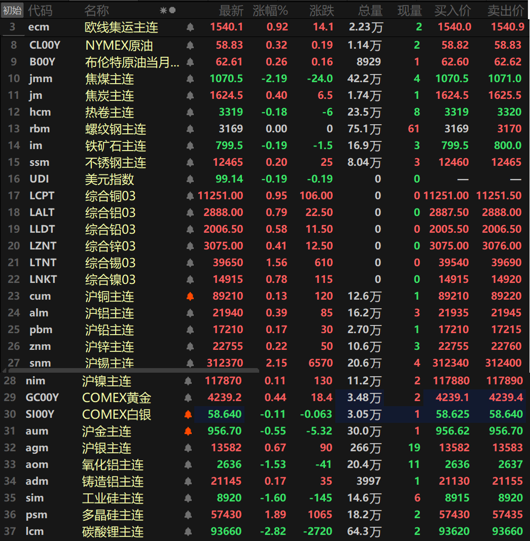 此外,碳酸锂主连跌2.82%,多晶硅主连涨1.89%,工业硅主连跌1.6%。欧线集运主连涨0.92%报1540.1。