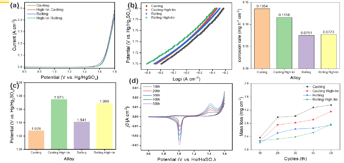 相同锡含量下,浇铸与轧制的析氧过电位相差不多,但高锡较低锡的析氧过电位更高,浇铸合金提高47mV,轧制合金提高28mV;耐腐蚀方面,浇铸和轧制,高锡合金比低锡合金更耐腐;