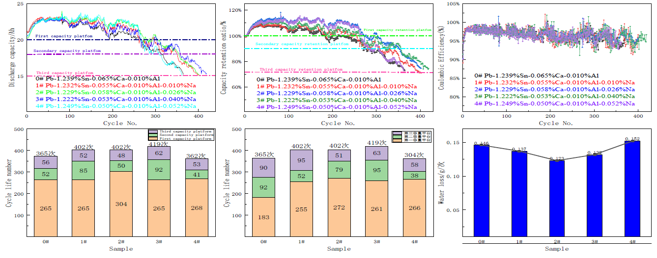 2. 添加Na元素板栅的电池,循环过程的容量保持率要优于不含Na的电池,循环次数可提高39.3%-48.6%;