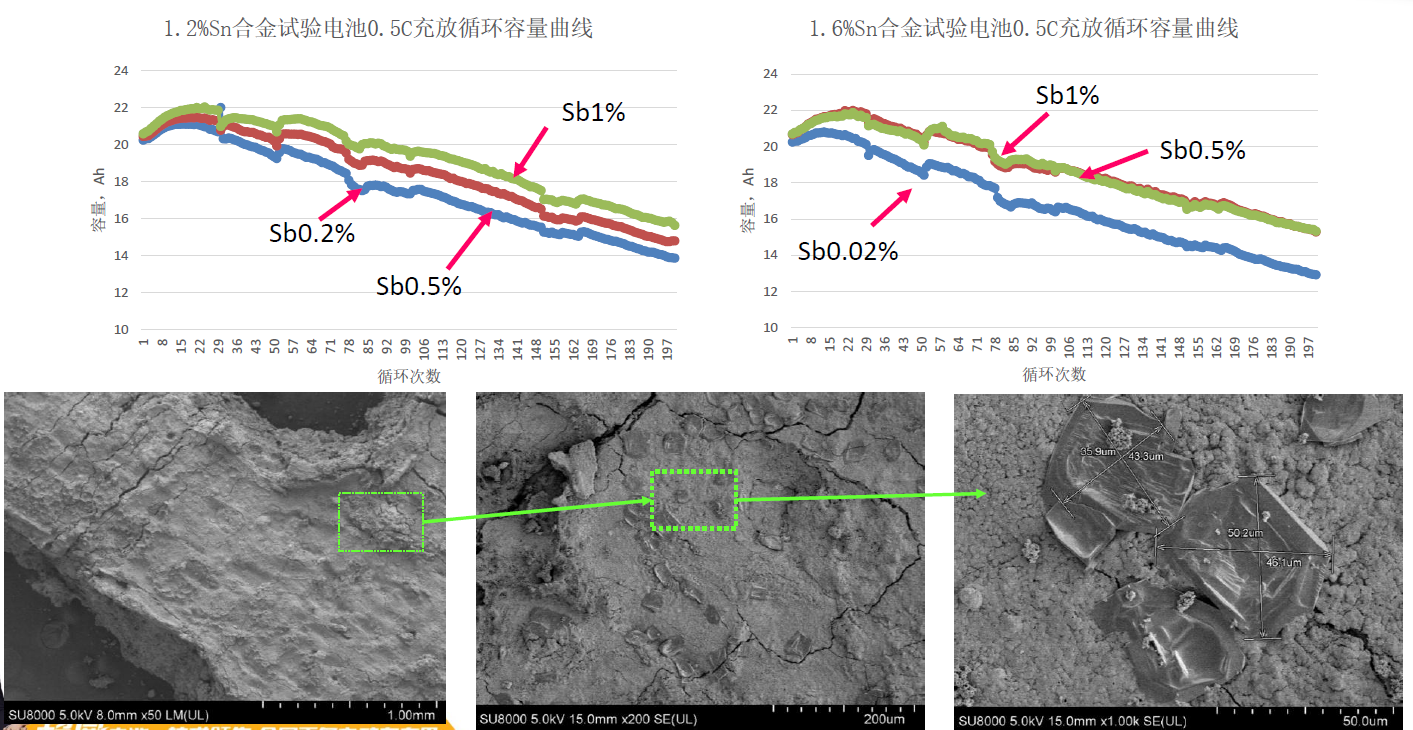 另外,取1.25%、1.45%和2%三种含量合金板栅,制造e-bike电池,以2hr100%DOD循环。测试结果显示,Sn含量增加,循环寿命增加。