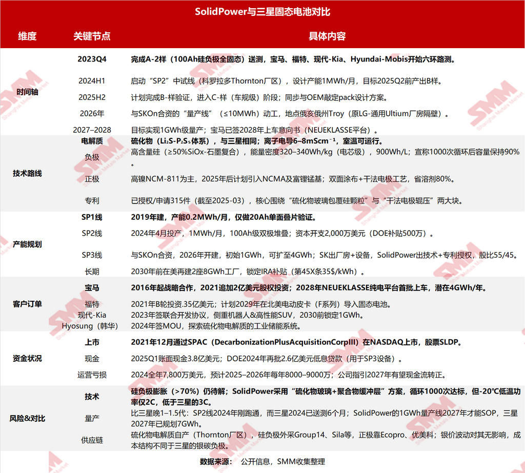 宝马+三星SDI+SolidPower(2025年10月):SolidPower供电解质;三星SDI负责电芯量产;宝马负责模组/电池包与实车集成,目标2027年示范车型验证。