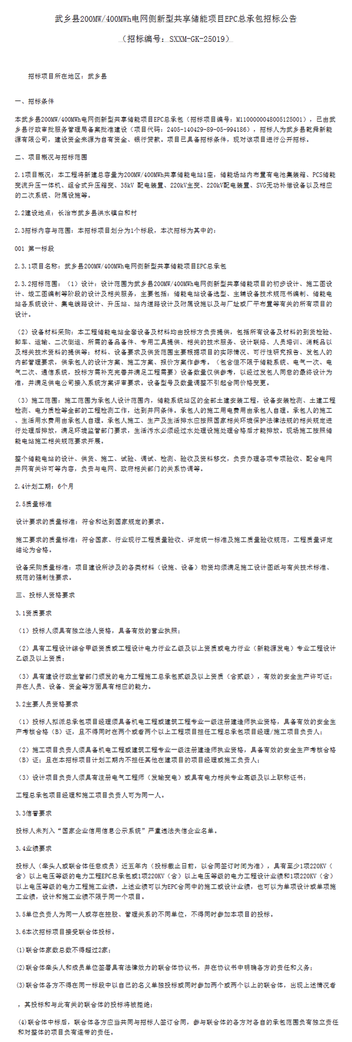 12月3日,武乡县200MW/400MWh电网侧新型共享储能项目EPC总承包招标公告发布。项目招标人为武乡县乾舜新能源有限公司,项目位于山西省长治市武乡县,将新建总容量为200MW/400MWh的共享储能电站1座,储能场站内布置有电池集装箱、PCS储能变流升压一体机、组合式升压箱变、35kV配电装置、220kV主变、220kV配电装置、SVG无功补偿设备以及相应的二次系统、附属设施等。本次招标范围包括整个储能电站的设计、供货、施工、试验、调试、检测、验收及资料移交,负责办理各项专项验收、配合电网并网有关许可等内容,负责与电网、政府相关部门的关系协调等。