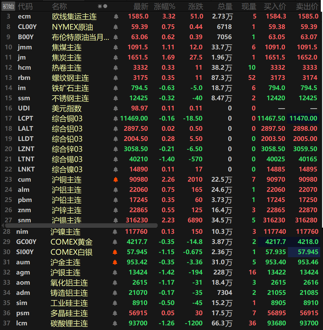 此外,碳酸锂主连跌1.26%,多晶硅主连涨0.05%,工业硅主连跌0.5%。欧线集运主连涨3.32%报11585。
