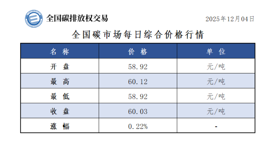 今日全国碳市场综合价格行情为: 开盘价58.92元/吨,最高价60.12元/吨,最低价58.92元/吨,收盘价60.03元/吨,收盘价较前一日上涨0.22%。