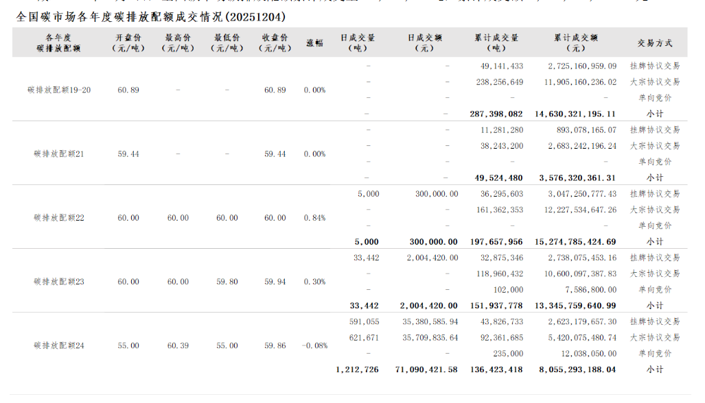 2025年1月1日至12月4日,全国碳市场碳排放配额成交量192,673,050吨,成交额11,849,752,706.63元。