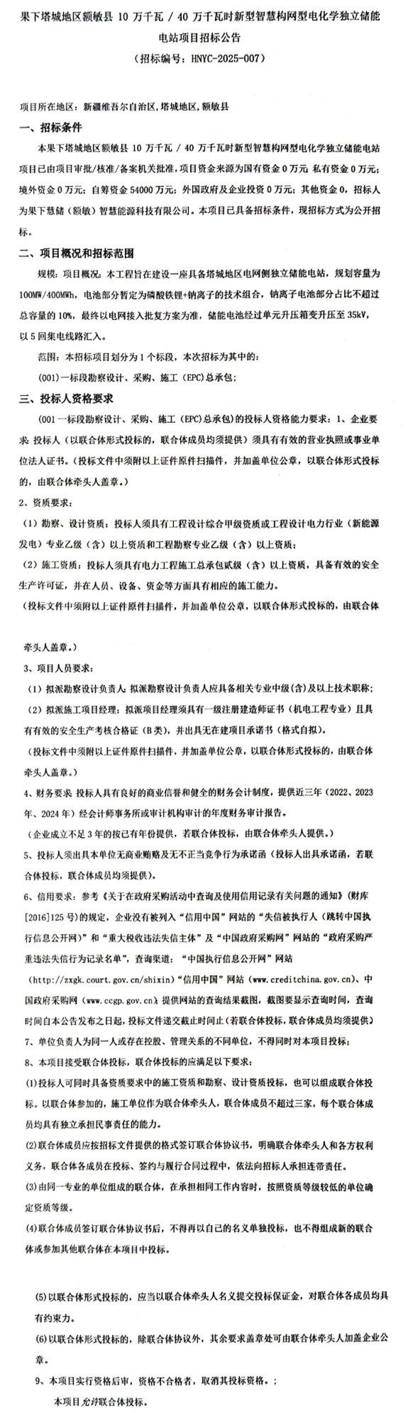 12月3日,果下塔城地区额敏县10万千瓦/40万千瓦时新型智慧构网型电化学独立储能电站项目招标公告发布。项目招标人为果下科技旗下的果下慧储(额敏)智慧能源科技有限公司,本工程新疆塔城地区建设一座电网侧独立储能电站,规划容量为100MW/400MWh,电池部分暂定为磷酸铁锂+钠离子的技术组合,钠离子电池部分占比不超过总容量的 10%,最终以电网接入批复方案为准,储能电池经过单元升压箱变升压至35kV,以5回集电线路汇入。本次招标需求为EPC总承包。