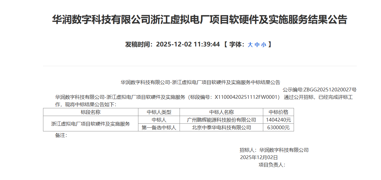 北极星储能网获悉,2025 年 12 月 2 日,华润数字科技有限公司-浙江虚拟电厂项目软硬件及实施服务中标结果公告发布。