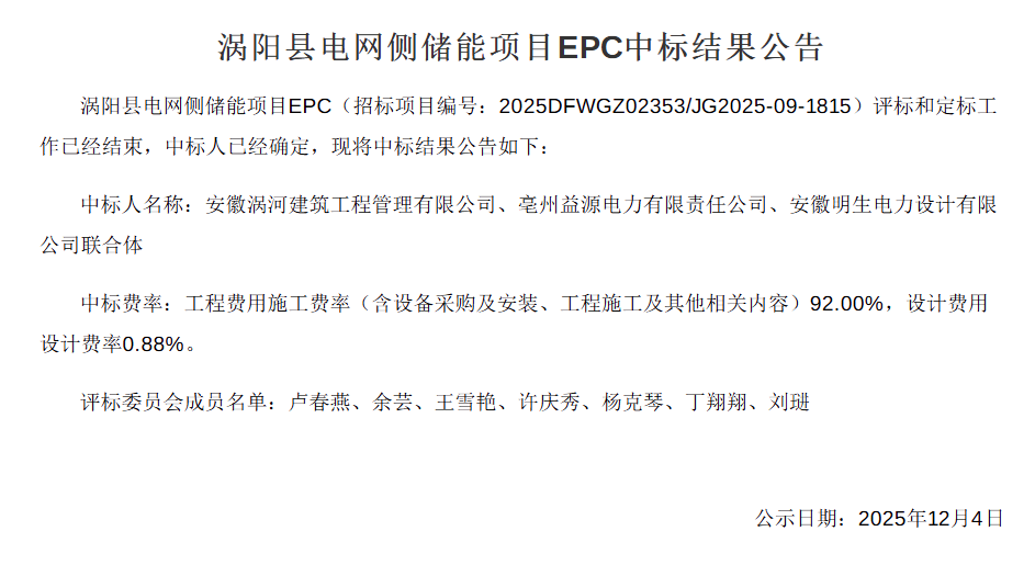北极星储能网获悉,12月4日,涡阳县电网侧储能项目EPC中标结果公告。