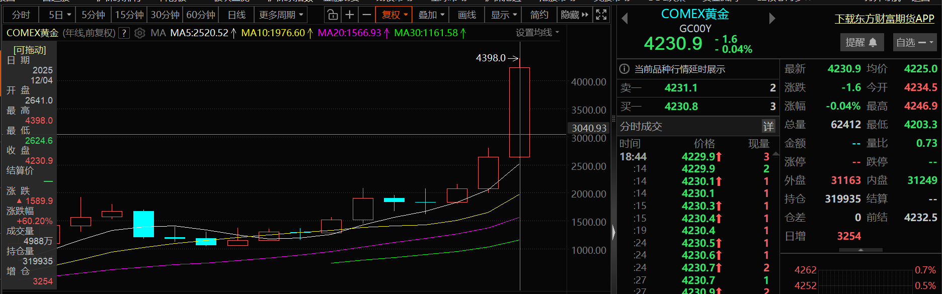 贵金属期货今年以来涨势可观,截至12月4日18:55分,COMEX黄金跌0.04%,报4230.9美元/盎司,其今年以来的年线涨幅为60.2%。