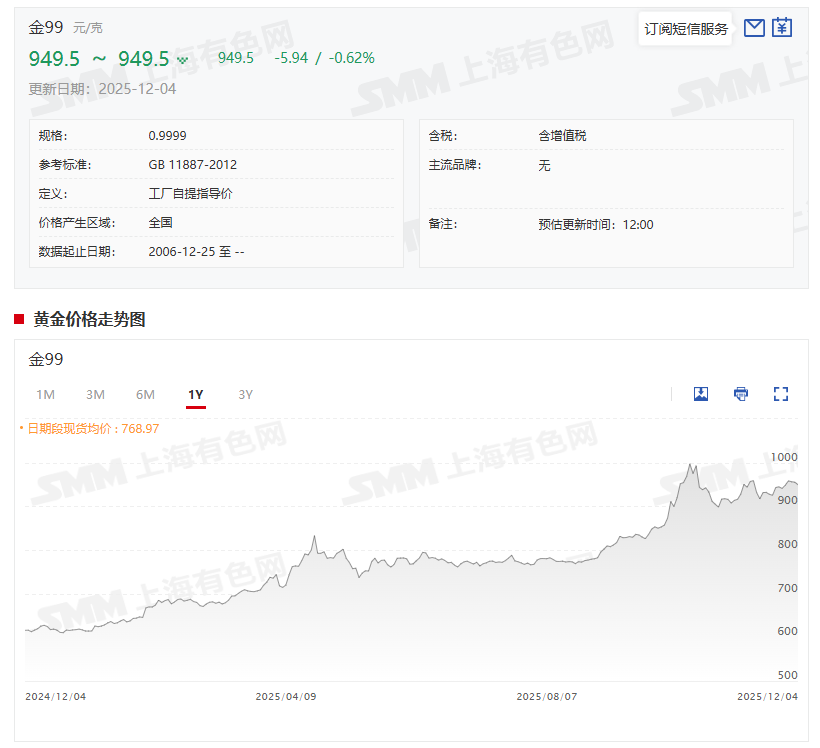 现货市场方面:金99现货12月4日的均价为949.5元/克,与2024年12月31日的均价614.4元/克相比,其半年的涨幅为54.54%。