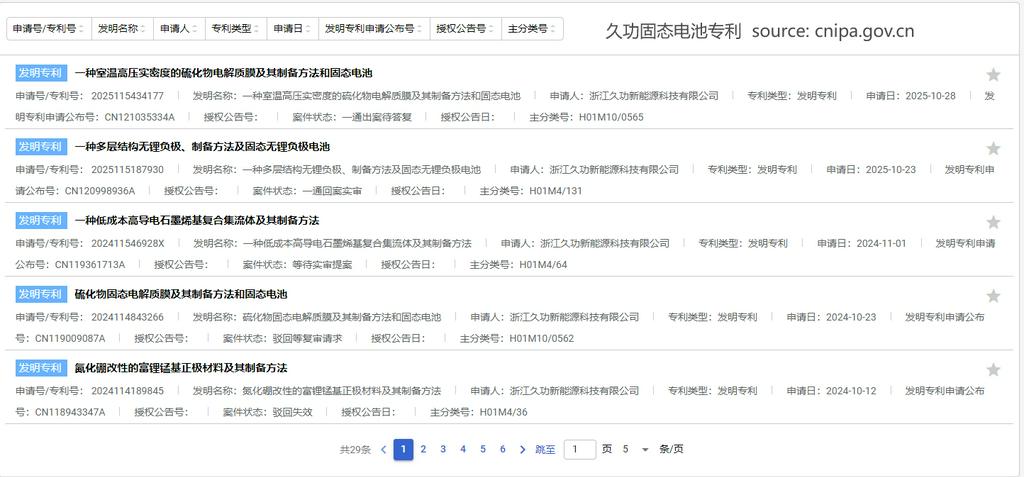 【固态电池:久功入库浙江省科技型中小企业名单】2025年12月02日根据浙江省经济和信息化厅最新发布的名单公示,浙江久功新能源科技有限公司凭借扎实的技术创新能力、卓越的研发实力以及良好的市场前景,成功入库 “浙江省2025年第四批科技型中小企业名单” !软包电池主要业务是生产干法全固态锂金属软包电池。