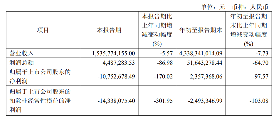 文灿股份10月29日披露2025年第三季度报告显示:前三季度公司实现营业总收入43.38亿元,同比下降7.73%;归母净利润235.74万元,同比下降97.57%;扣非净利润亏损249.33万元,上年同期盈利8082.88万元。
