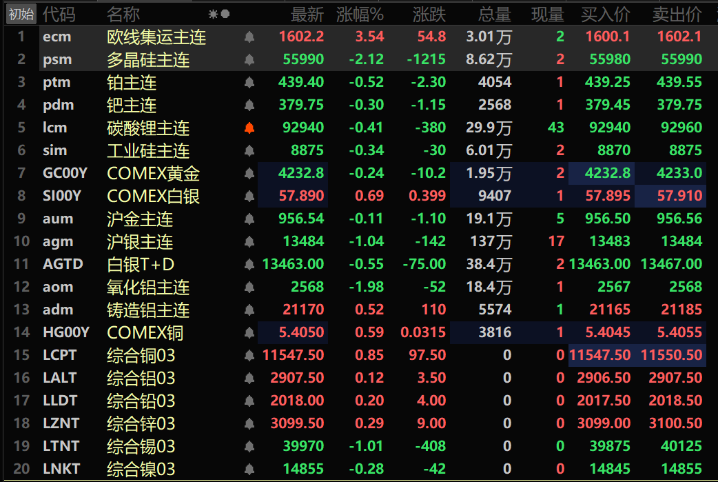 此外,铸造铝主连期货涨0.52%,氧化铝主连延续前5个交易日的跌势继续跌1.98%。碳酸锂主连跌0.41%。工业硅主连跌0.34%。多晶硅主连跌2.12%。