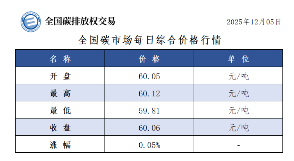 今日全国碳市场综合价格行情为: 开盘价60.05元/吨,最高价60.12元/吨,最低价59.81元/吨,收盘价60.06元/吨,收盘价较前一日上涨0.05%。