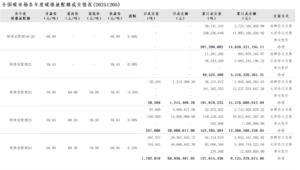 2025年1月1日至12月5日,全国碳市场碳排放配额成交量194,232,943吨,成交额11,941,705,298.91元。