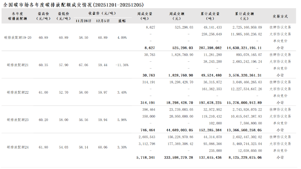 2025年1月1日至12月5日,全国碳市场碳排放配额成交量194,232,943吨,成交额11,941,705,298.91元。