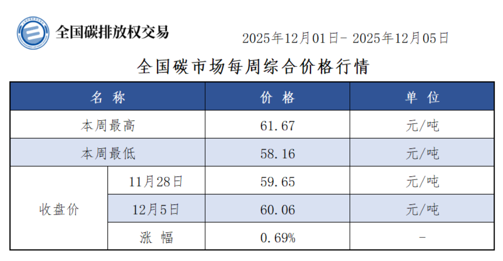 本周全国碳市场综合价格行情为:最高价61.67元/吨,最低价58.16元/吨,收盘价较上周五上涨0.69%。
