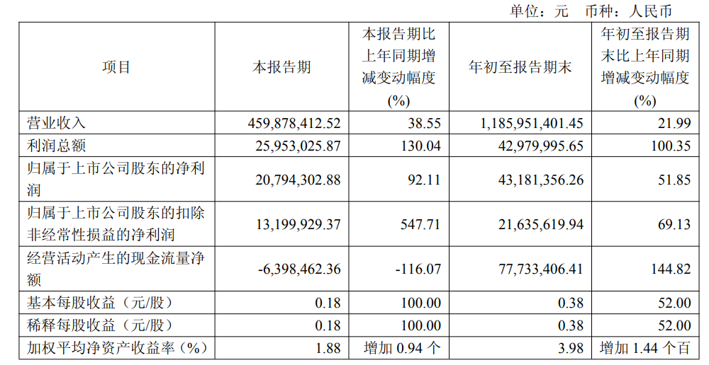 大地熊10月28日披露2025年第三季度报告显示:前三季度公司实现营业总收入11.86亿元,同比增长21.99%;归母净利润4318.14万元,同比增长51.85%;扣非净利润2163.56万元,同比增长69.13%。