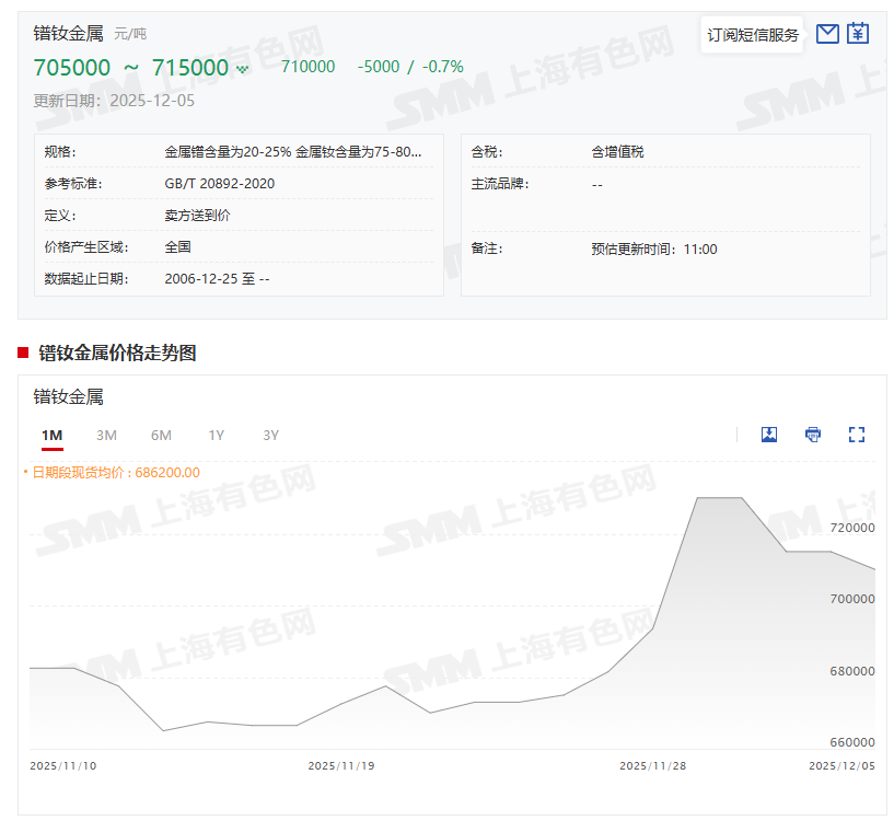 据SMM报价显示,12月5日,镨钕金属价格下调至70.5-71.5万元/吨。