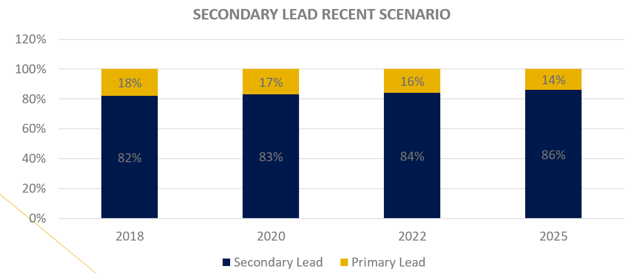 印度铅行业的结构性驱动力来自回收利用,再生铅持续占总供应量的80%以上。再生铅市场正以5%的年复合增长率增长。随着行业对再生铅的认可度和依赖程度不断提高,在更多应用场景下的需求增加将进一步巩固其增长趋势。