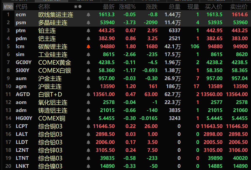此外,铸造铝主连期货跌0.66%,氧化铝主连微跌0.04%。碳酸锂主连涨1.8%。工业硅主连跌2.66%。多晶硅主连跌3.73%。