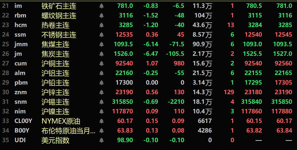 黑色系普跌,铁矿跌0.83%,螺纹跌1.52%,热卷跌1.2%,不锈钢涨0.36%。双焦方面:焦煤主力合约跌6.14%,焦炭主力合约跌6.47%。