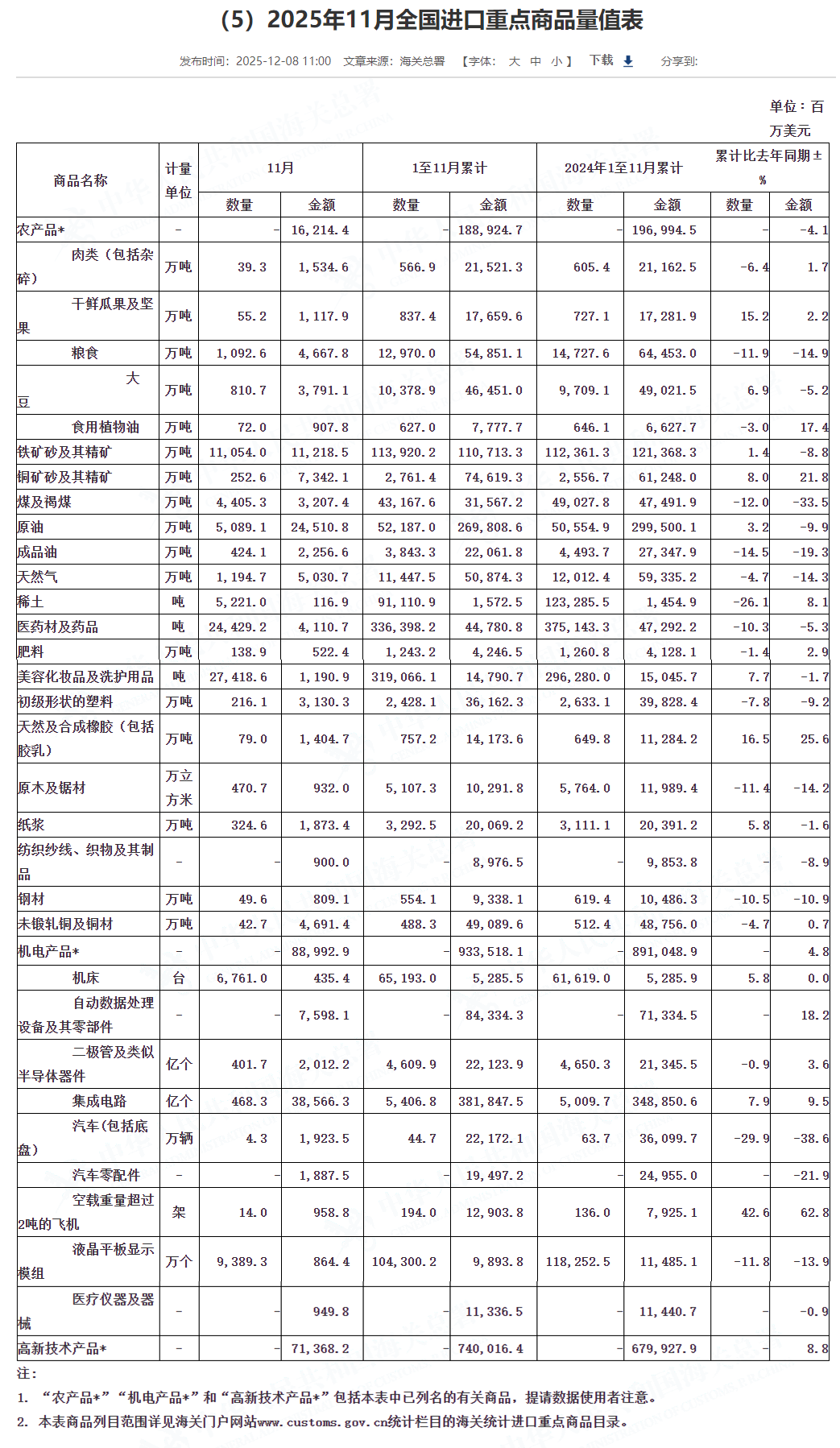 2025年11月铁矿砂及其精矿进口11,054.0万吨,同比2024年11月增加8.5%。2025年1~11月累计进口113,920.2万吨,同比2024年1~11月增加1.4%。