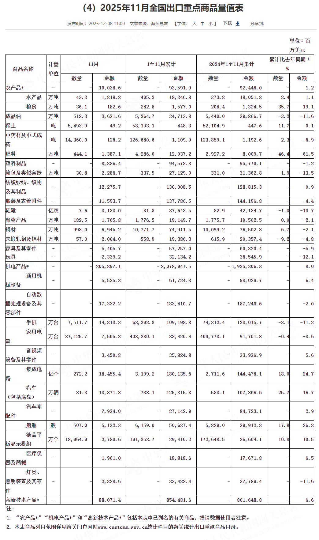 前11个月,我国出口机电产品14.89万亿元,增长8.8%,占我出口总值的60.9%。其中,自动数据处理设备及其零部件1.31万亿元,下降1.3%;集成电路1.29万亿元,增长25.6%;汽车8969.1亿元,增长17.6%。同期,出口劳密产品3.7万亿元,下降3.5%,占我出口总值的15.1%。其中,服装及衣着附件9872.6亿元,下降3.7%;纺织品9313.3亿元,增长1.7%;塑料制品6776亿元,下降0.5%。出口农产品6702.1亿元,增长2%。