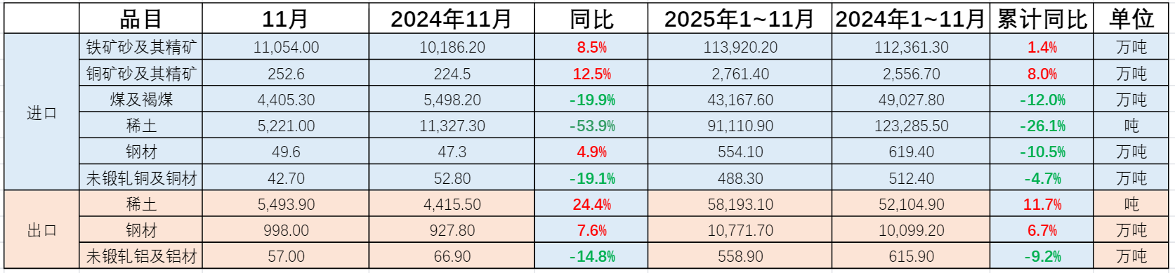 2025年11月稀土出口5,493.9吨,同比2024年11月增加24.4%。2025年1~11月累计出口58,193.1吨,同比2024年1~11月增加11.7%。