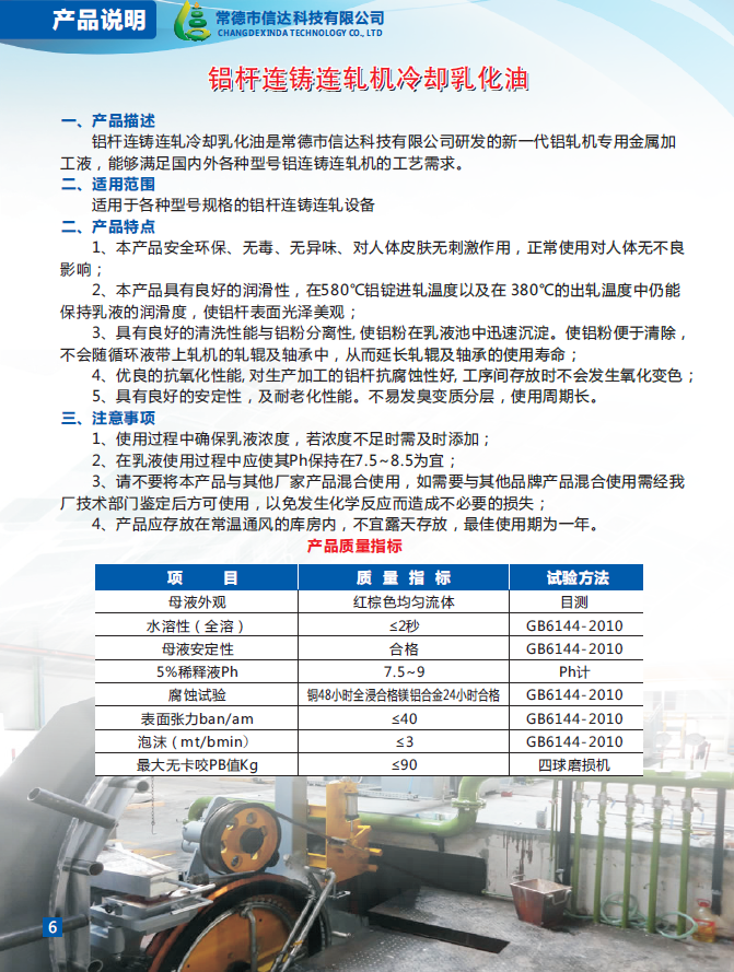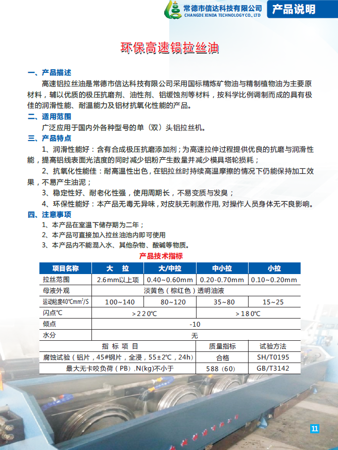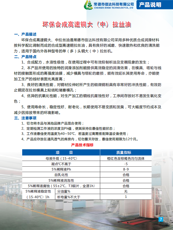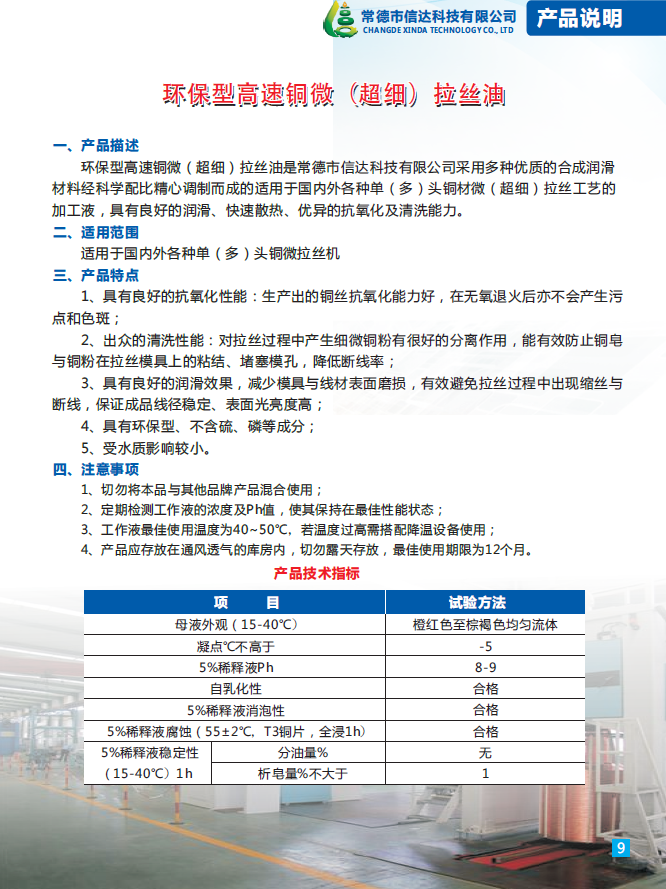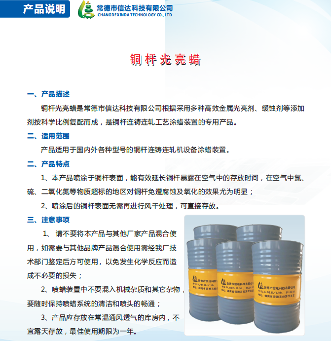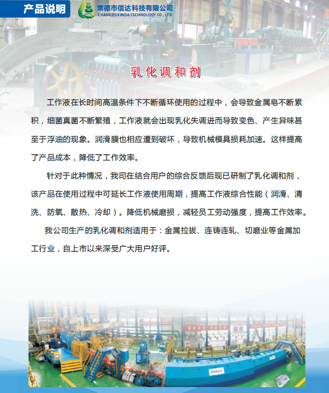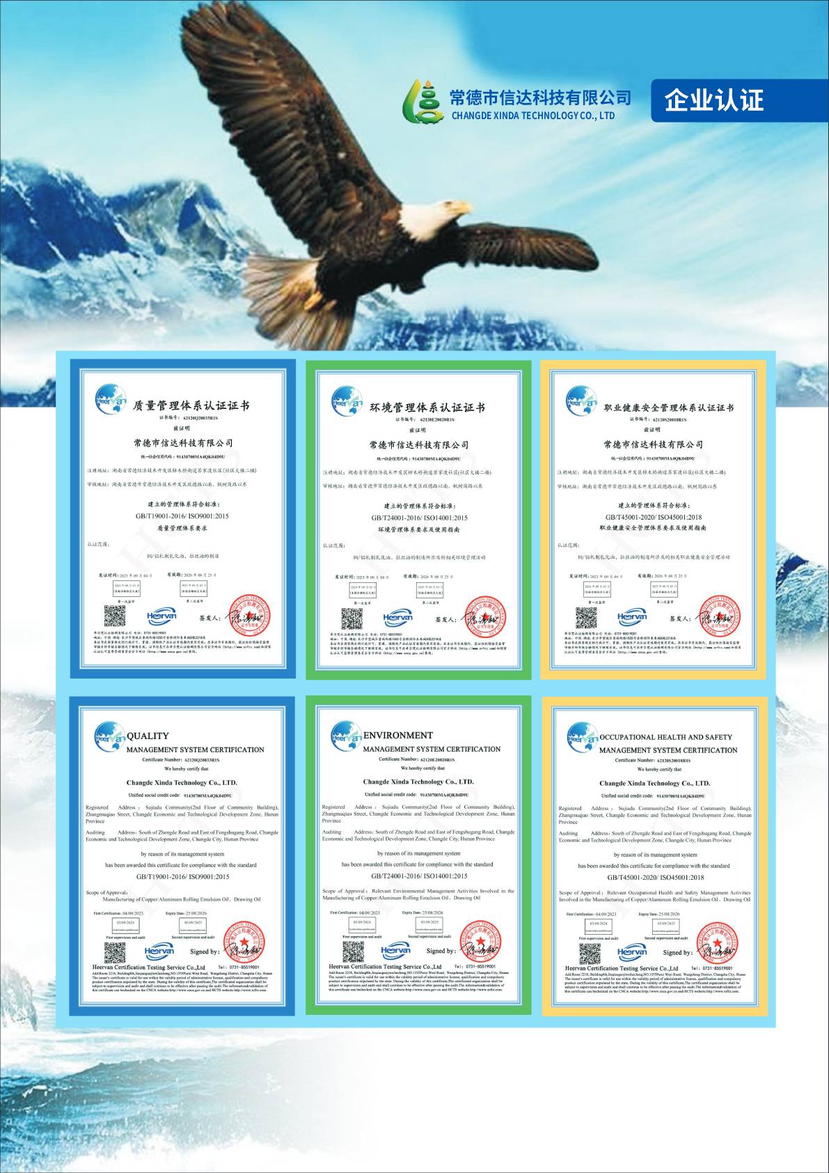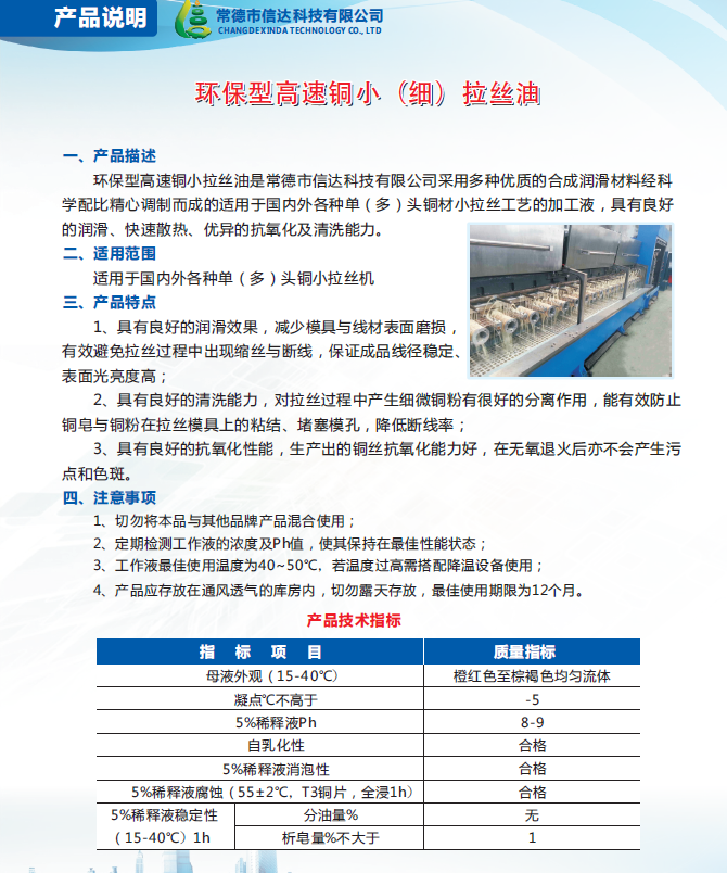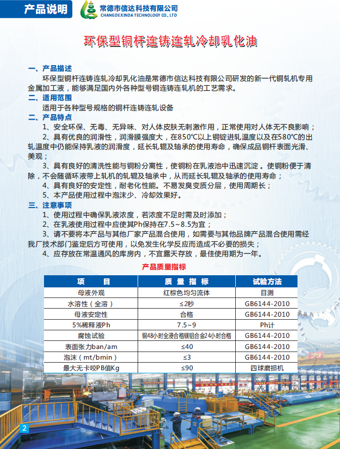 常德市信达科技有限公司前身有着40余载的发展历程,自2019年经常德市政府招商引资入驻常德市经济技术开发区,注册资本 500 万元。公司位于常德市德山经济开发区德政路以南、枫树岗路以东,总占地面积约40余亩,地理位置优越,是生产铜 (铝) 连铸连轧冷却乳化油、光亮铜杆清洗剂、铝轧引杆环保(无烟)润滑油、各种规格型号铜(铝)线材拉丝油、抗氧化剂、退火液等产品的专业厂家。公司管理科学,设备先进,技术力量雄厚,所生产的产品畅销海内外并得到广大用户的好评。近年来,各行各业如雨后春笋迅速发展,商业竞争激烈,产品优胜劣汰。