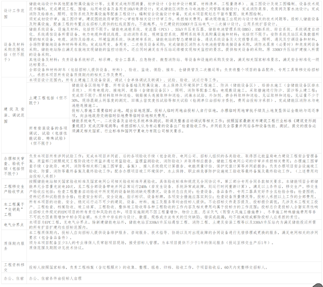 此次招标范围为项目全流程EPC总承包工作,涵盖储能系统全部勘察、设计、设备与材料采购供应、建筑及安装调试,还需负责办理涉网试验、各类验收备案手续、工程移交生产等工作。