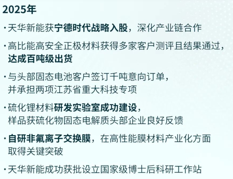综合来看,天华新能固态电池已具备关键材料的实验室小试能力,2025年内可实现硫化锂、富锂锰基正极的吨级送样;真正的全固态电芯量产仍需等待2026-2027年产业链整体成熟。