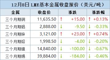 伦敦时间12月8日17:00(北京时间12月9日01:00),LME三个月期铜上涨15美元,或0.13%,收报每吨11,635.5美元,早些时候创下每吨11,771美元的历史高点,今年以来铜价的涨幅为30%。