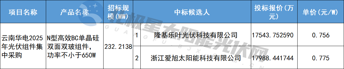 12月5日,云南华电2025年光伏组件集中采购项目中标候选人公示,中标候选人第一名为隆基乐叶光伏科技有限公司,单价0.756元/W。具体如下: