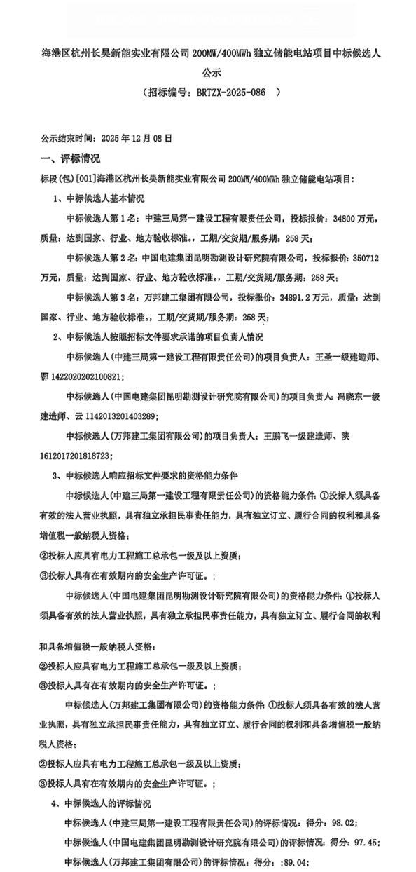 北极星储能网获悉,12月5日,海港区杭州长昊新能实业有限公司200MW/400MWh独立储能电站项目中标候选人公示。