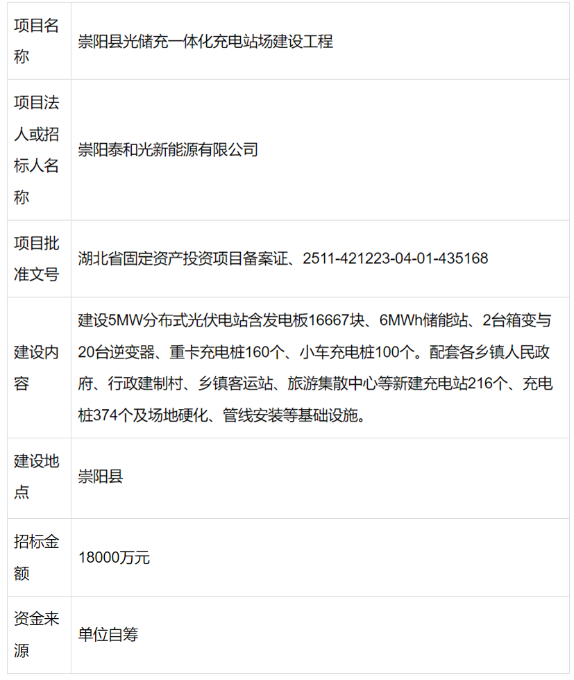 2025年12月8日,咸宁市公共资源电子交易平台对外发布崇阳县光储充一体化充电站场建设工程招标计划,该项目招标人为崇阳泰和光新能源有限公司,招标金额达18000万元,项目资金来源为单位自筹。