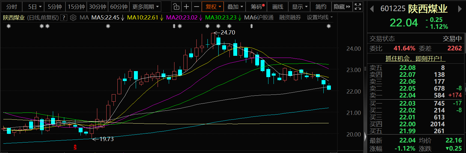 12月9日,陕西煤业的股价出现下跌,截至9日13:42分,陕西煤业跌1.12%,报22.04元/股。