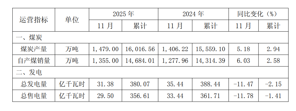 陕西煤业12月8日公告,2025年11月,公司煤炭产量为1479万吨,同比增长5.18%;自产煤销量为1355万吨,同比增长6.03%。发电方面,11月总发电量为31.38亿千瓦时,总售电量为29.50亿千瓦时。2025年1-11月,陕西煤业累计煤炭产量为16016.56万吨,同比增长2.94%;累计自产煤销量为14684.01万吨,同比增长2.58%。
