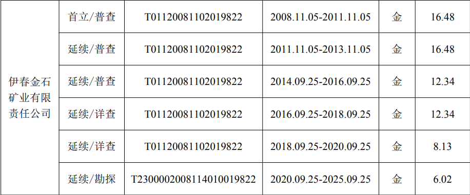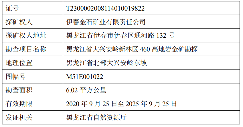 金石矿业已于 2025 年 8 月 20 日向新林区自然资源局提出“黑龙江省大兴安岭新林区 460 高地岩金矿勘探”探矿权(证号:T2300002008114010019822)延续登记申请的查询要求,新林区自然资源局于 2025 年 8 月22 日出具了《关于黑龙江省大兴安岭新林区 460 高地岩金矿勘探探矿权延续登记申请核查意见的函》,经核查,该申请属省自然资源厅发证权限,新林区自然资源局核实情况如下:(1)原探矿权面积 6.02 平方公里,申请缩小勘查范围后面积 5.287 平方公里(已提交资源量的范围 2.468 平方公里不计入扣减基数,符合(自然资规[2023]6 号)文件的规定。),缩小比例为 20.636%;(2)申请范围不涉及永久基本农田、生态保护红线、自然保护地、Ⅰ级和Ⅱ级保护林地、天然林保护重点区域、基本草原、国际重要湿地、国家重要湿地、饮用水水源保护区;(3)该探矿权无权属争议,未发现违法违规勘查行为;(4)申请项目范围符合大兴安岭地区新林区国土空间总体规划(2021-2035年);(5)经核查,申请项目无涉矿信访问题。根据上述情况,新林区自然资源局建议同意该探矿权延续申请。目前,460 高地岩金矿探矿权的延续手续已报黑龙江省自然资源厅审核。