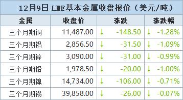 伦敦时间12月9日17:00(北京时间12月10日01:00),LME三个月期铜下跌148.5美元,或1.28%,收报每吨11,487.0美元。周一曾触及纪录高位11,771美元。