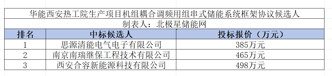 华能西安热工院生产项目机组耦合调频用组串式储能系统框架协议招标【重新招标】中标候选人公示