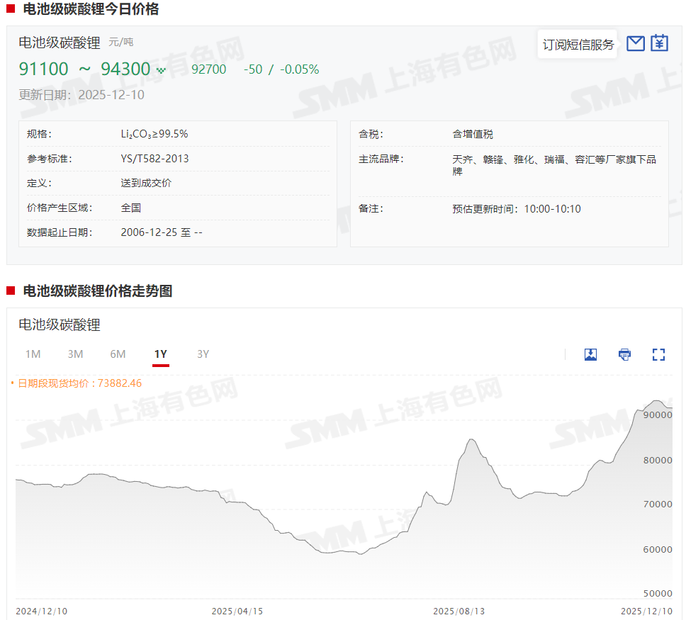 综合来看,在供给稳步提升、需求整体相对持稳的背景下,预计12月碳酸锂仍将保持去库,但幅度较11月将有所放缓。截至12月10日,国产电池级碳酸锂现货报价在91100~94300元/吨左右,均价报92700元/吨。
