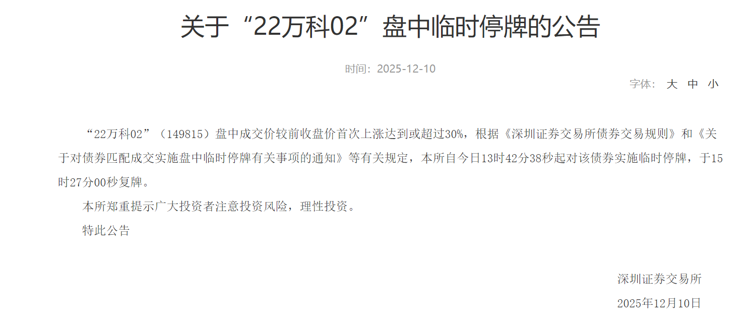 消息面上,据上证报报道,12月10日,万科首个展期债券“22万科MTN004”的债权人大会召开,将讨论债券展期事宜。12月10日,多只境内债券飙涨一度触发交易所临时停牌,比如“22万科02”“22万科04”“22万科06”等盘中涨幅均超过30%,因上述债券盘中成交价较前收盘价首次上涨达到或超过30%,深交所10日对上述的债券实施盘中临时停牌。