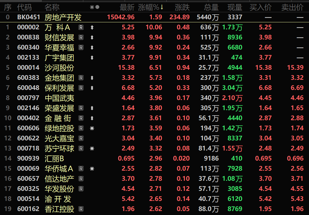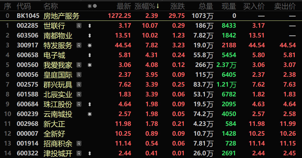 政策暖风劲吹、市场成交数据向好叠加龙头房企债务进展落地等消息共振,带动房地产板块于12月10日午后强势拉升。海南、青海、四川等多地的“十五五”规划建议明确加快构建房地产发展新模式;上海杨浦区推出高额购房补贴、武汉土地市场成交活跃等地方层面利好频出;易居研究院发布数据显示,今年前11个月,一线城市二手住宅累计成交同比增长约5%,为近四年来首次突破51万套大关;据上证报报道,万科首个展期债券“22万科MTN004”的债权人大会10日召开,将讨论债券展期事宜。截至10日收盘,房地产开发板块和房地产服务板块分别涨1.59%、2.39%。个股方面:万科A、财信发展、华夏幸福、广宇集团、世联行、南都物业等涨停,特发服务、沙河股份、金地集团、保利发展以及中国武夷等涨幅居前。