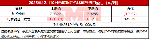 2025年12月10日电解铜沪伦比值与进口盈亏【SMM价格】