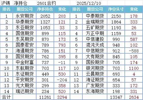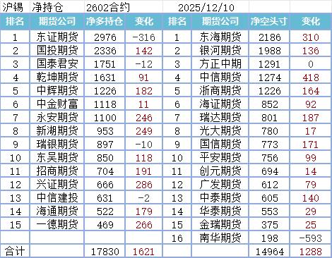 空头席位则出现明显分歧,银河期货大幅增持空单 860 手,空头持仓增至 2044 手,成为当日空头增仓主力;金瑞期货、中信建投也分别加仓 333 手、429 手,对短期走势保持谨慎。但中信期货选择逆势减空 297 手,空头持仓回落至 4552 手,同时加多291手,净空持仓减少588手。